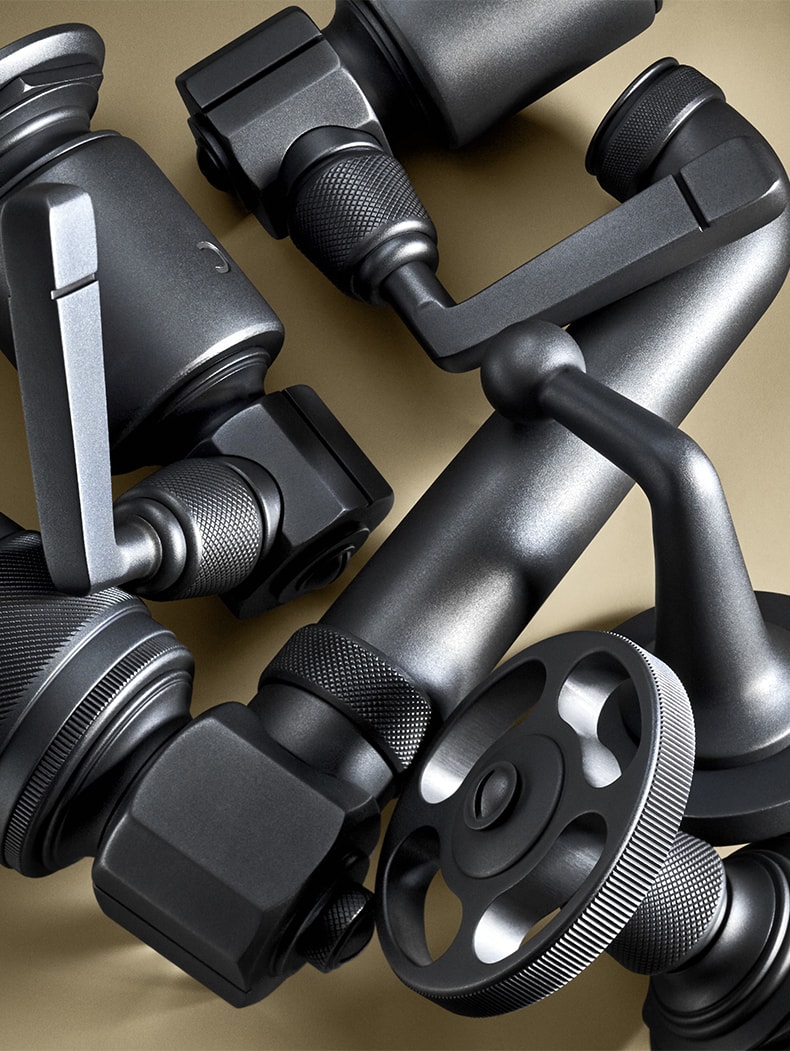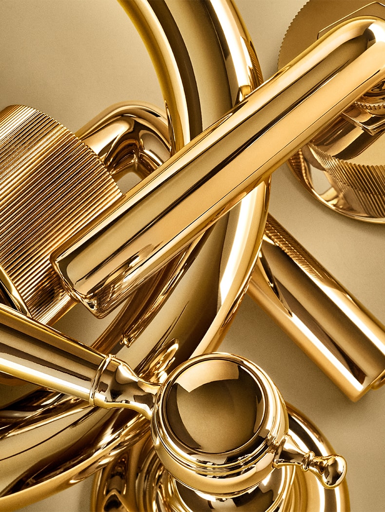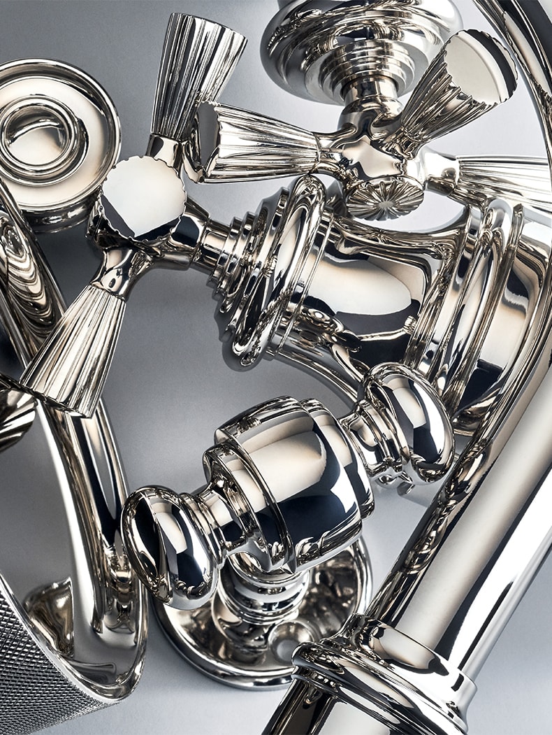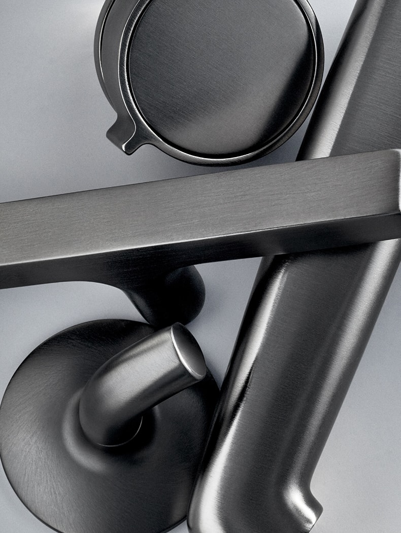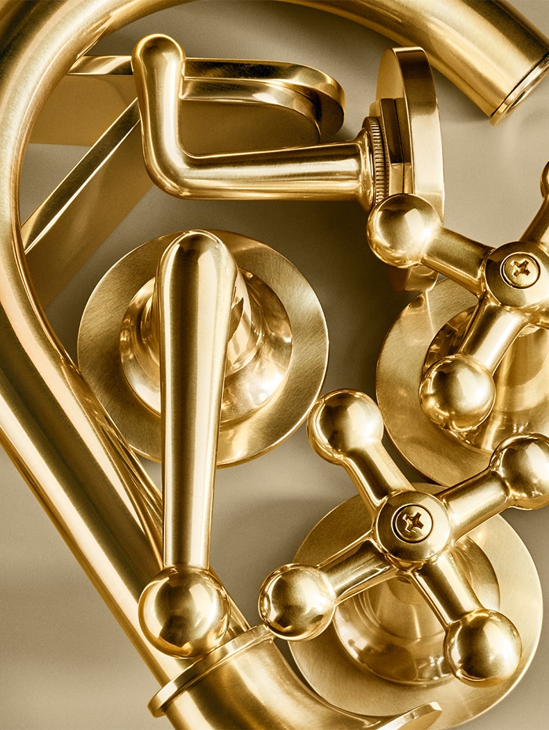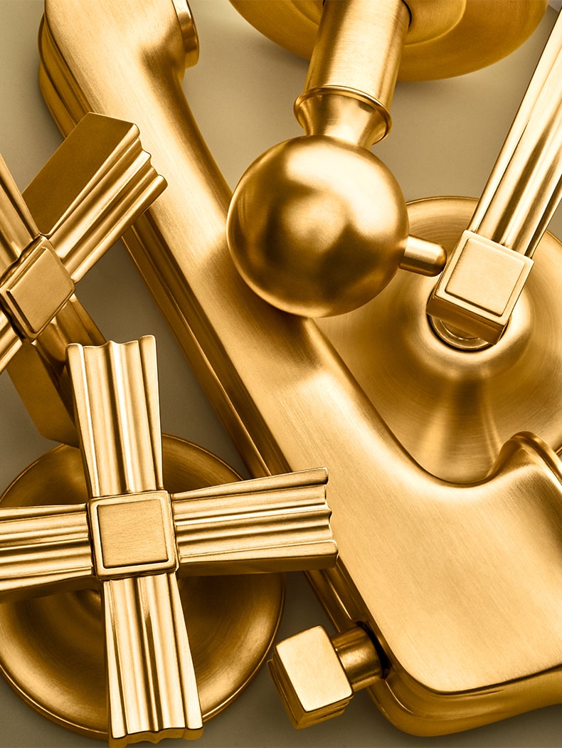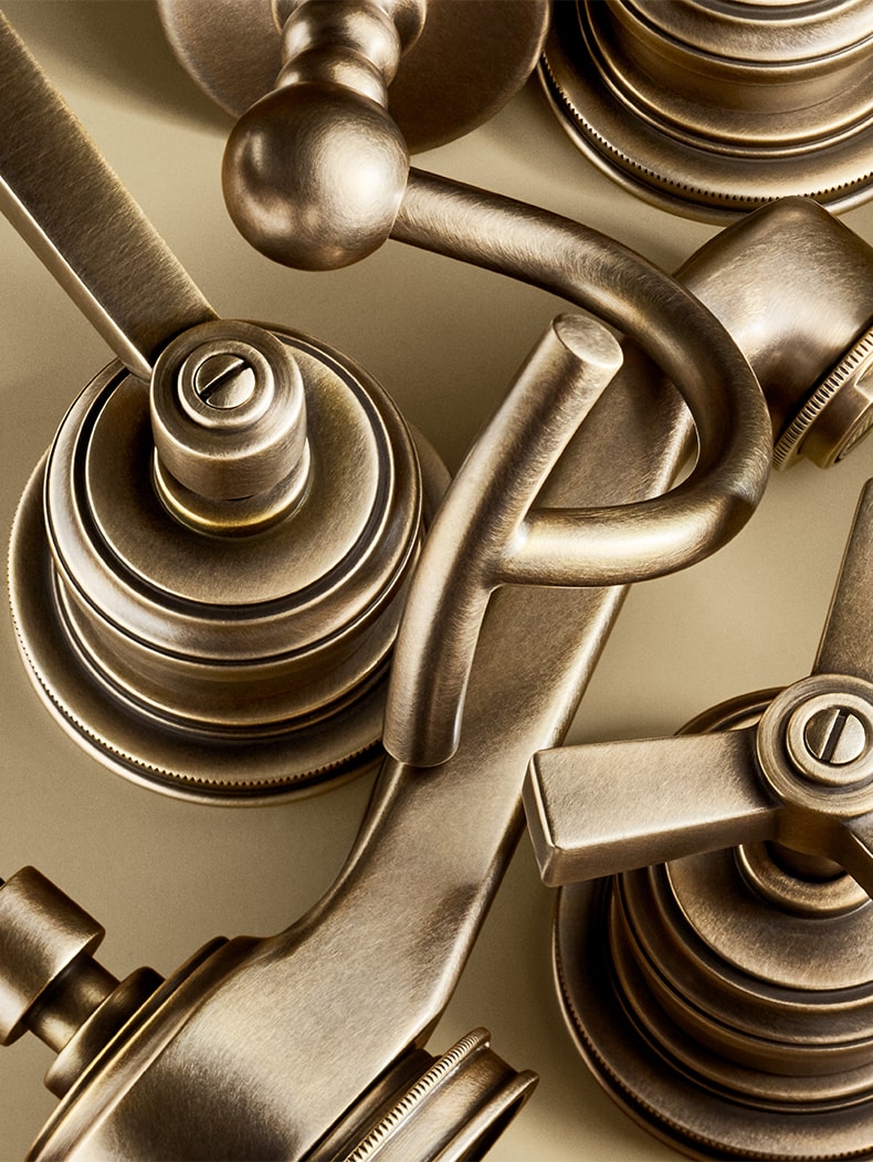 Our exclusive core finishes fall into three families, brass, nickel and elemental, each made up of expertly defined choices that graduate from light to dark.