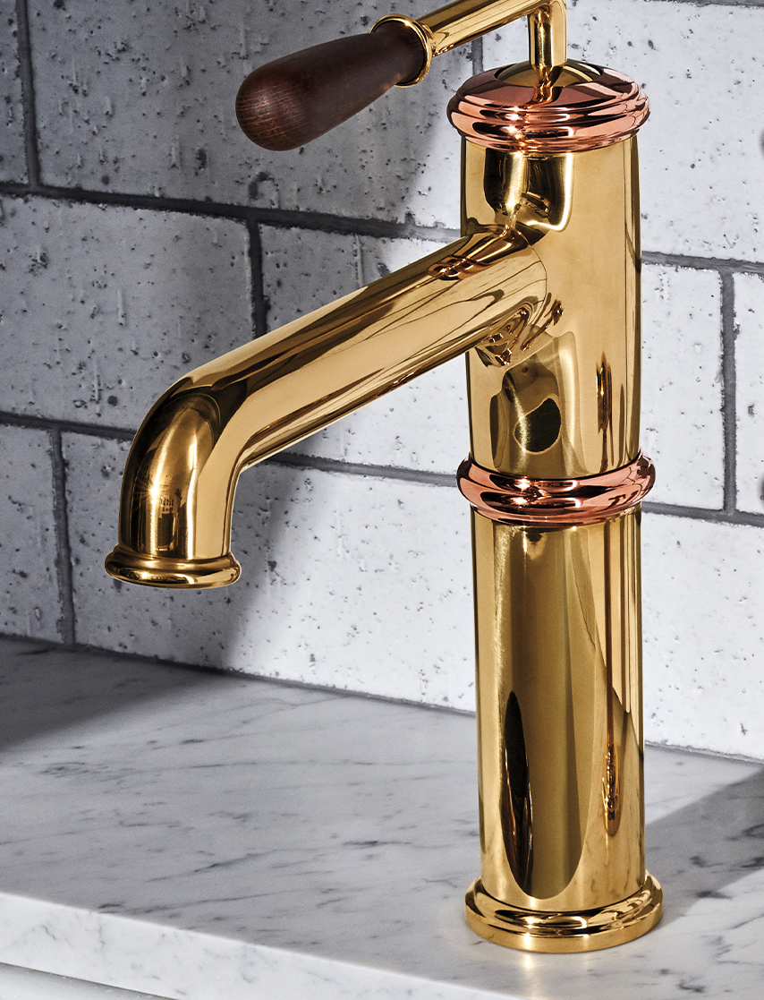 A warm luminous metal that elevates all styles of design, making them feel richer and more sophisticated. Over time, it assumes a slightly deeper tone.